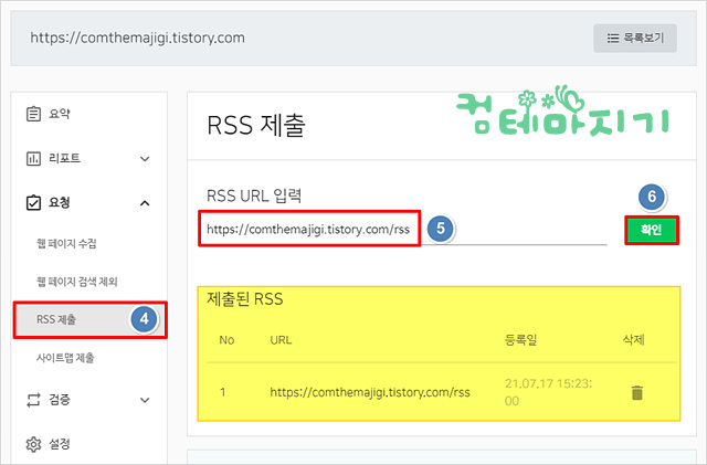▼ 4. RSS 제출을 클릭한 다음, 5. RSS URL을 입력합니다.(티스토리 주소/rss) 6. 확인을 클릭하면 아래에 제출된 RSS를 확인할 수 있습니다.