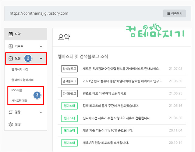 ▼ 왼쪽 메뉴에서 2. 요청을 클릭한 다음, 3. RSS 제출과 사이트맵 제출을 차례대로 해주면 됩니다.