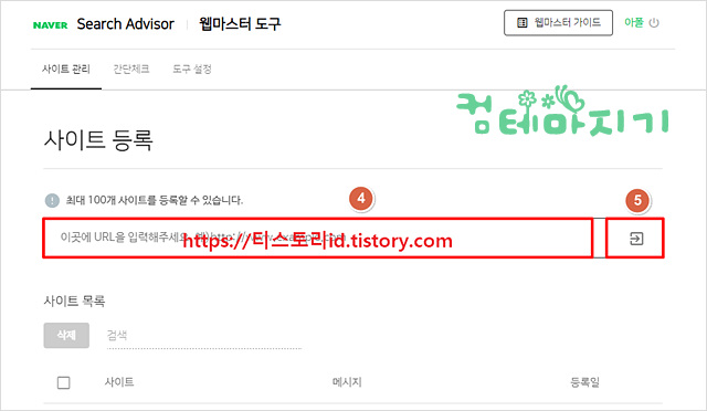 ▼ 사이트 등록 화면에서 4. 내 티스토리 블로그 주소를 입력한 다음, 5. 다음아이콘을 클릭합니다.