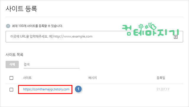 ▼ 사이트 등록 화면에서 1. 내 티스토리 주소를 클릭합니다.