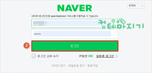 ▼ 네이버 로그인 화면에서 아이디/비번을 입력한 다음, 2. 로그인을 클릭합니다.