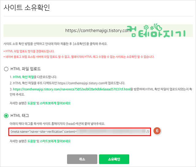 ▼ 사이트 소유확인 화면에서 HTML 태그를 선택하여, 6. 메타태그 내용을 복사합니다.(클릭 드래그-블록설정한 다음, Ctrl+C로 복사)
