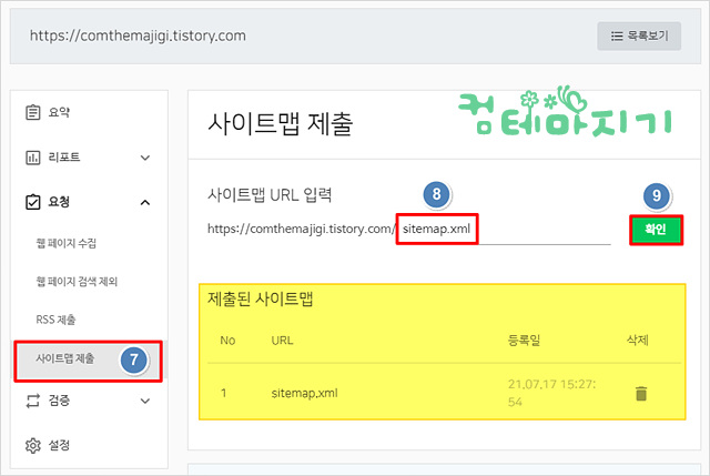 ▼ 7. 사이트맵 제출을 클릭한 다음, 사이트맵 URL 입력에서 8. sitemap.xml을 입력한 다음, 9. 확인을 클릭합니다. 아래 제출된 사이트맵을 확인할 수 있습니다. 이 시간에는 티스토리 블로그 네이버검색 서치 어드바이저에 등록해 주는 방법에 대해서 알아보았습니다.
