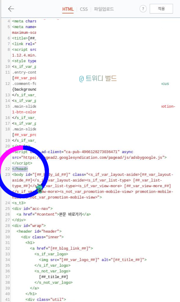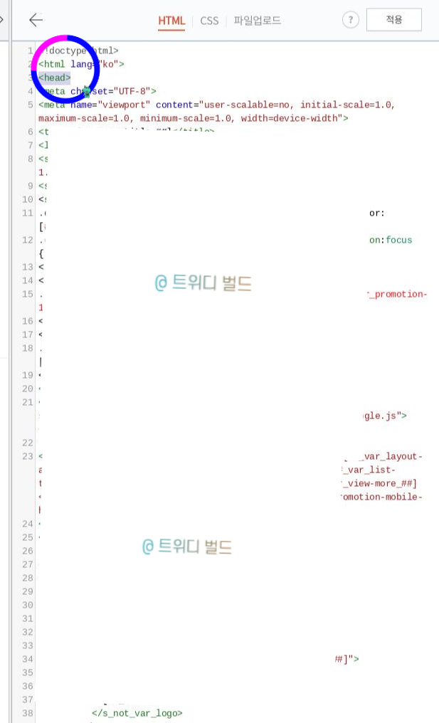 1) HTML 편집을 열고 바로 보이는 다양한 태그 스크립트 위 맨위를 보면 <head>라는 말그대로 헤트 부분이 보일거다 그러면