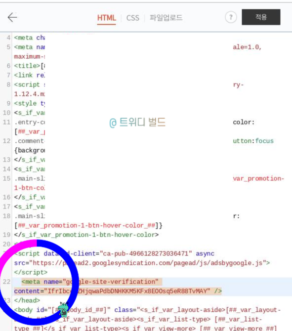 위에서 복사한 HTML 태그 스크립트를 head와 /head 사이에 넣어주어야 합니다! (방법은 밑에 사진 참고!)