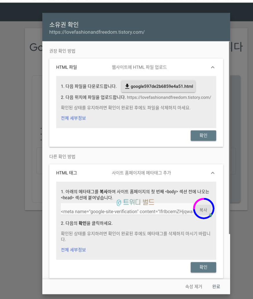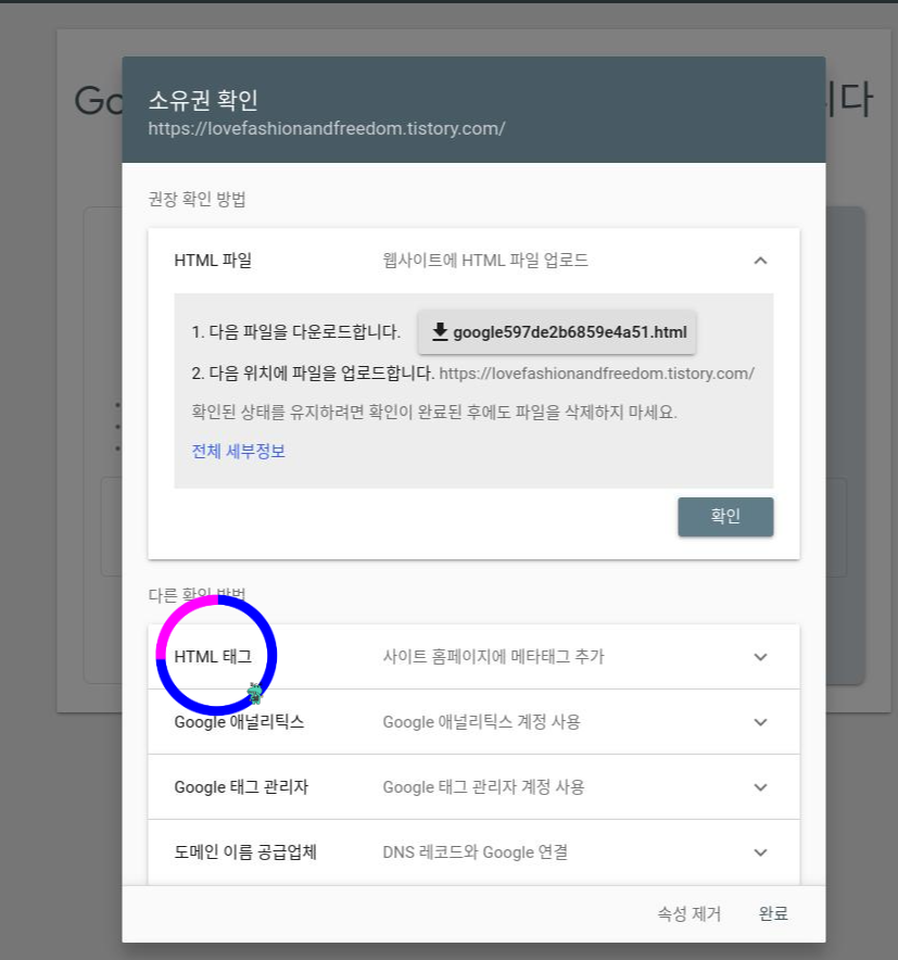 여기서 Google 애널리틱스(GA) 혹은 Google 태그 관리자(준말 : GTM) 계정이 있으신 분들은 해당 태그를 통해서 소유권을 인증하시면 더 쉽습니다만, 대부분 저의 블로그 포스팅을 보시는 분들은 ga 혹은 gtm이 없으신 분들도 많기 때문에 'HTML 파일'을 통해서 소유권 인증하는 방법 안내 go! 하겠습니다 :) 쉬우니깐 겁 먹지 말고 follow follow me! 밑의 HTML 태그 클릭!