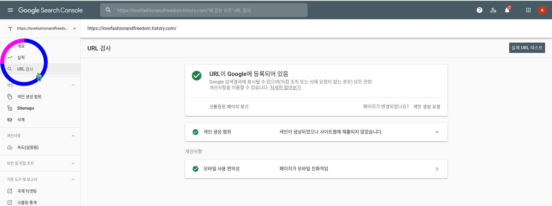 그 다음에 왼쪽 상단 위에 'URL 검사'를 클릭하고나서 블로그 주소를 넣고 엔터! enter를 누르면!