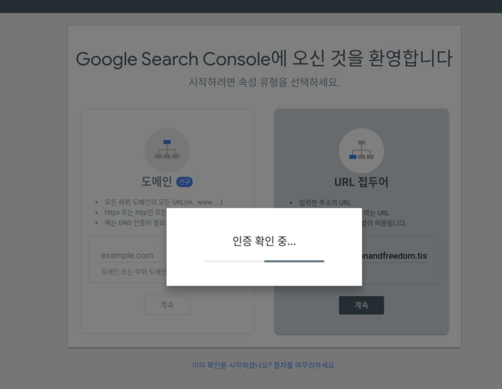 8. 다시 서치콘솔로 와서 인증하기 클릭하면! 인증 확인 중 -> 소유권 인증 완료! 짝짝짝! 그러면 완료!