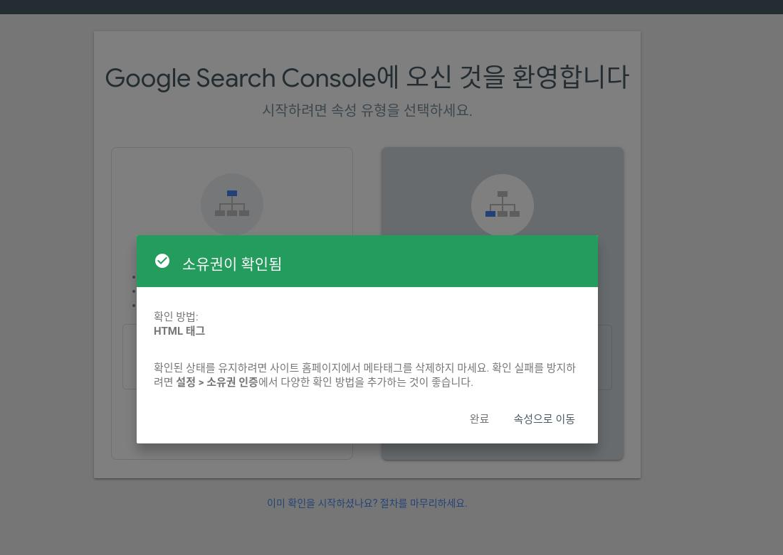 구글 서치 콘솔이 완료되었다는 페이지와 함께 구글 서치 콘솔 페이지로 드디어 속성이 1개 만들어져서 들어가게됩니다!