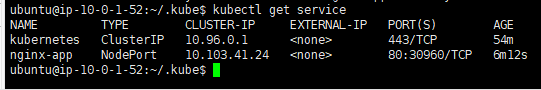 ubuntu@ip-10-0-1-52:~/.kube$ kubectl expose pod nginx-app --type=NodePort