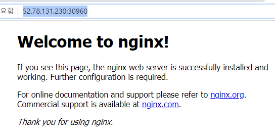 http://52.78.131.230:30960/ (80포트가 아닌 내부포트 접속으로 성공)