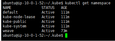 ubuntu@ip-10-0-1-52:~/.kube$ kubectl get namespace
