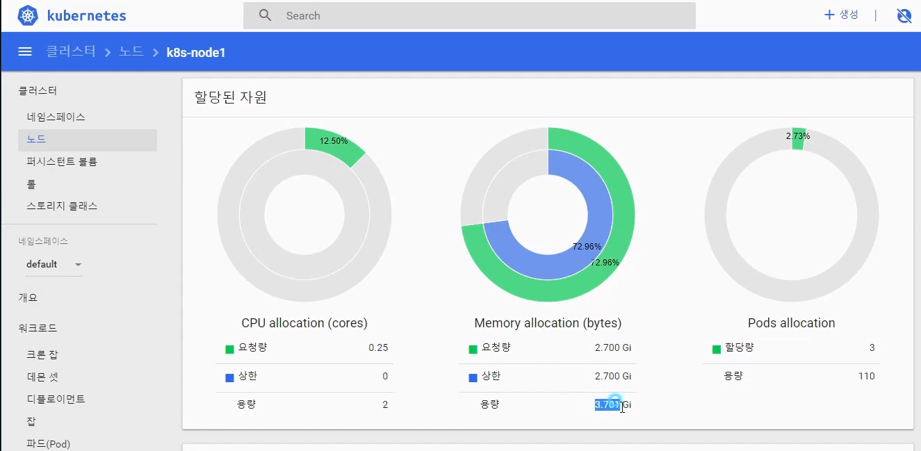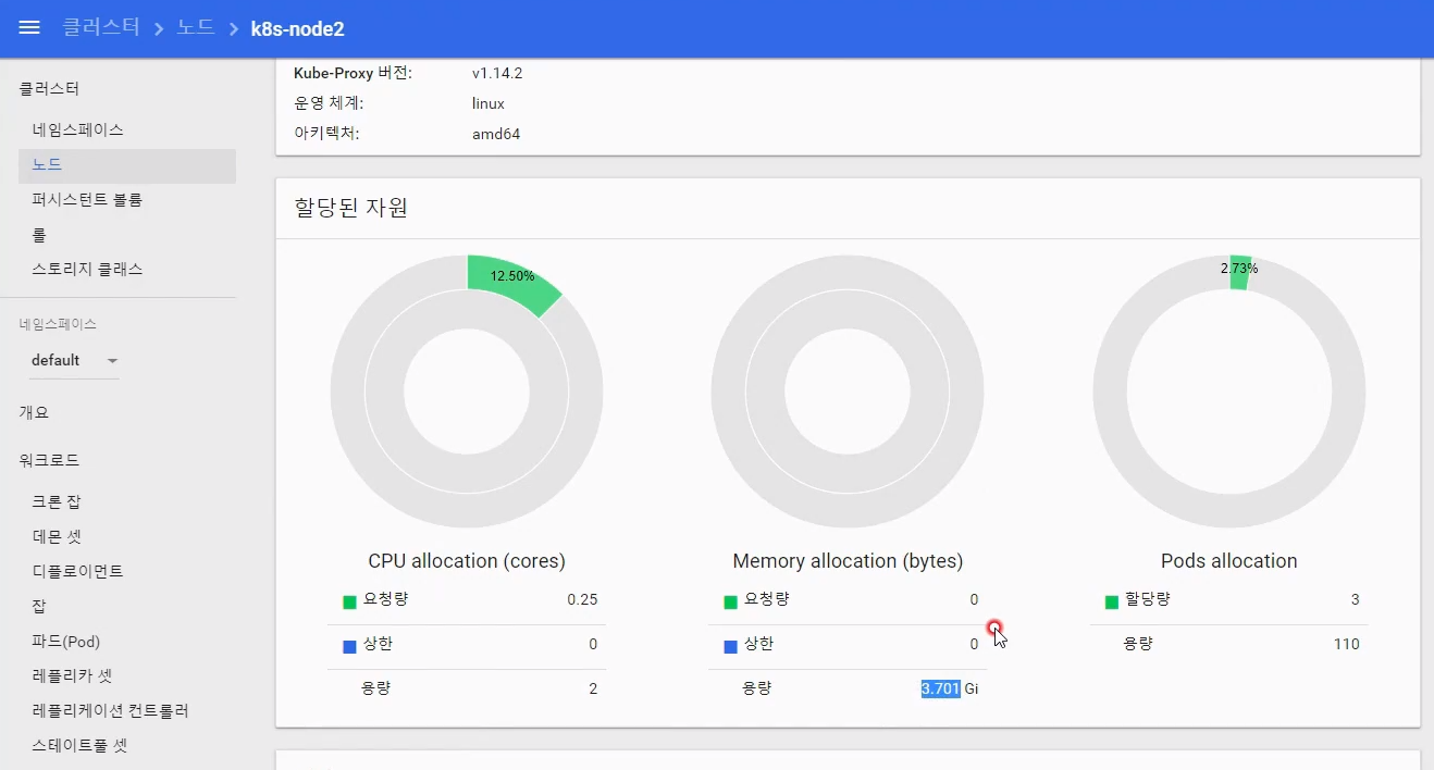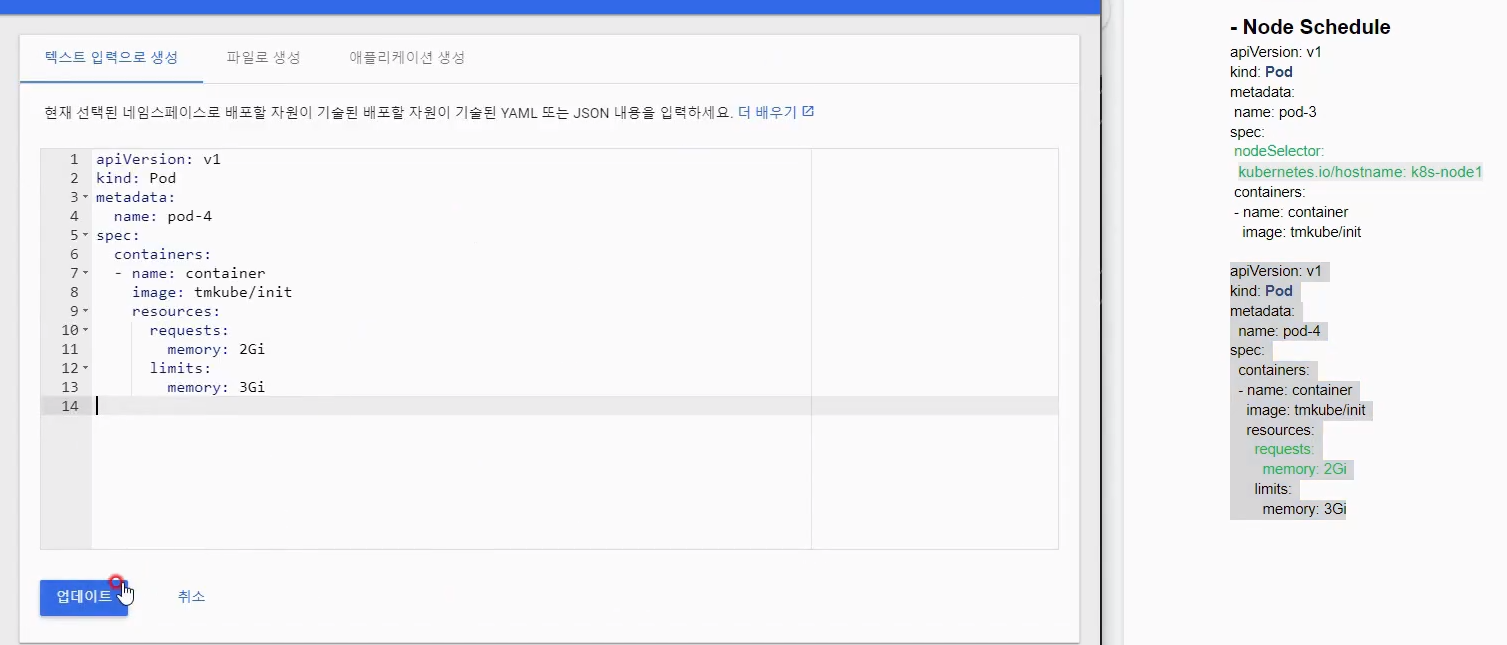 자원 사용량이 없는 노드2에 pod-4 가 생성됨