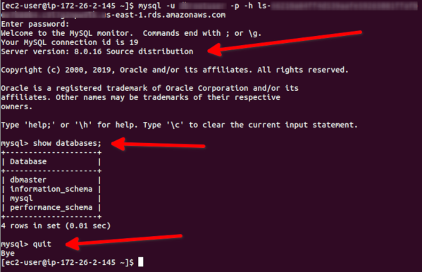 mysql을 사용하는 것은 매우 쉽습니다. 쉘 프롬프트에서 호출하십시오. 이 예에서는 RDS에 연결합니다.